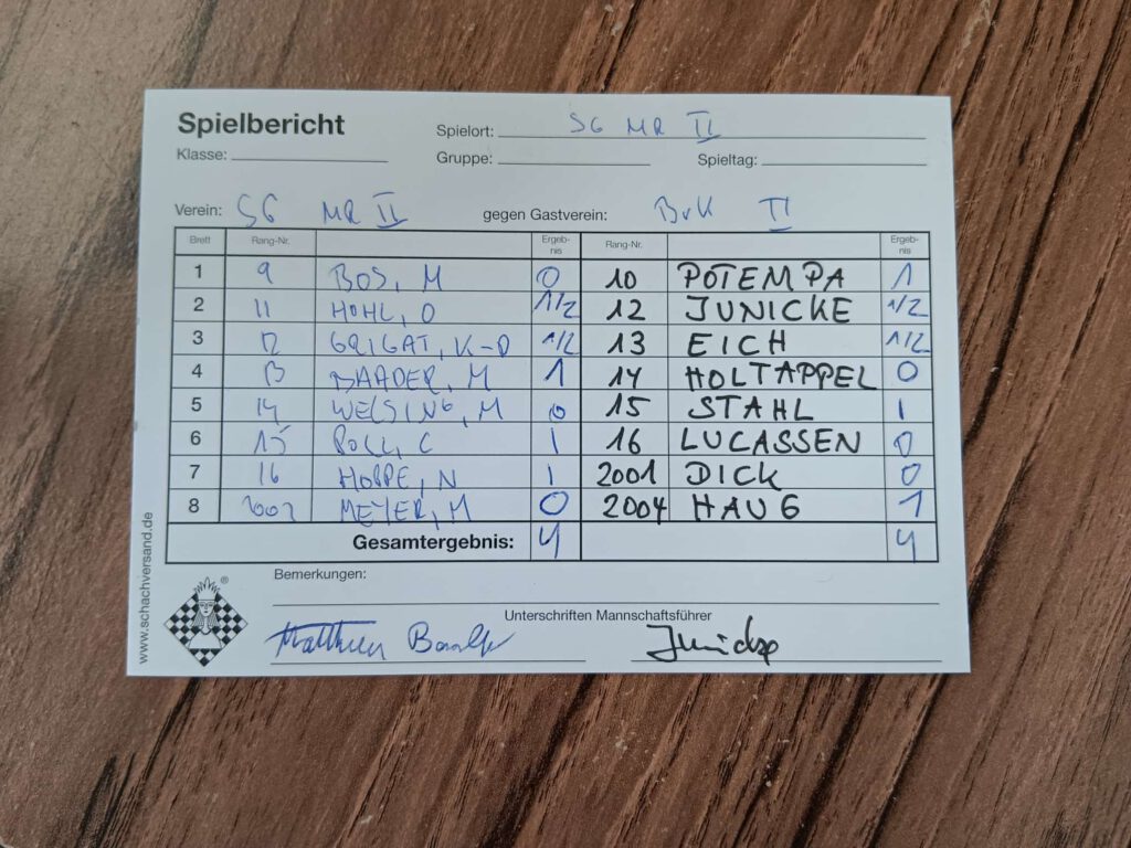 Im Abstiegskampf konnten wir heute den ersten Mannschaftspunkt erringen. In einem ausgeglichenen Kampf konnten Matthieu, Christian und Norbert ihre Partien gewinnen. Für uns geht es jetzt in den letzten drei Runden um den Ligaverbleib, die nächste Chance haben wir bereits am 22.02 bei Tus Xanten.